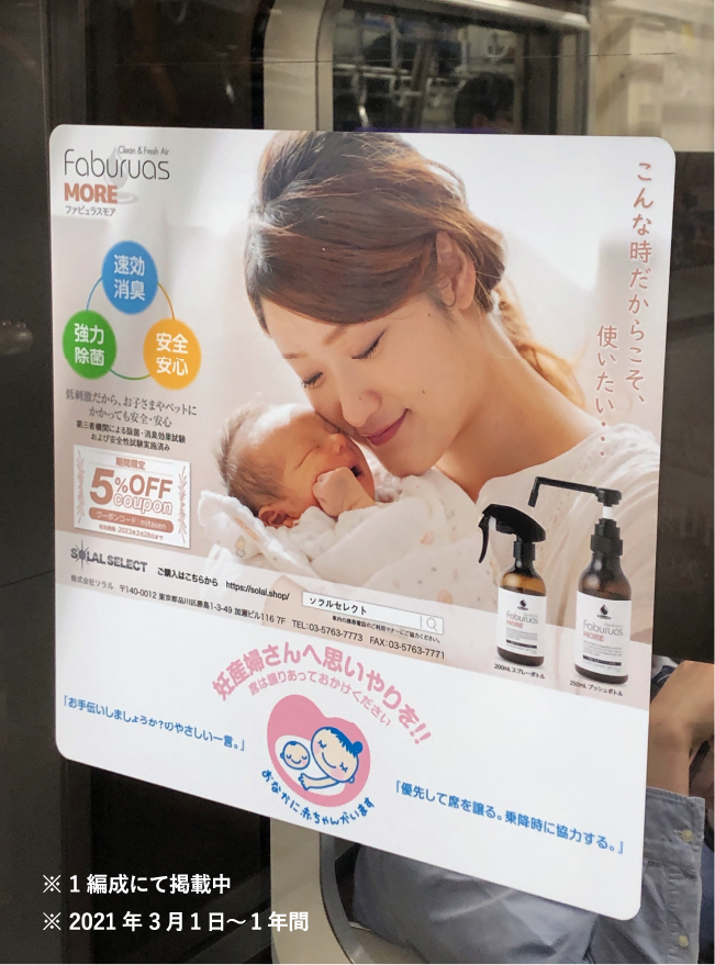 ソラルセレクトでは、妊産婦にやさしい環境づくりを目指すマタニティマークの理念に賛同し、都営地下鉄三田線にタイアップ広告を掲載いたしました。これからも赤ちゃんとその安全を願うお母さん達にとって、安心して使える製品づくりを心がけてまいります。